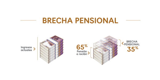 La Brecha Pensional es la diferencia entre tu último sueldo y el dinero real que recibes al momento de pensionarte. Esta diferencia en promedio es del 35%, es decir, que al momento de tu jubilación, recibes aproximadamente el 65% de tu último salario.